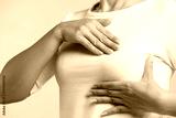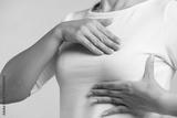 Woman hand checking lumps on her breast for signs of breast cancer on gray background. Healthcare concept.