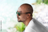 profile of 40s casual adult bald beard wearing sunglasses in white T-shirt with light bokeh of water natural background