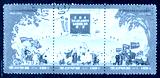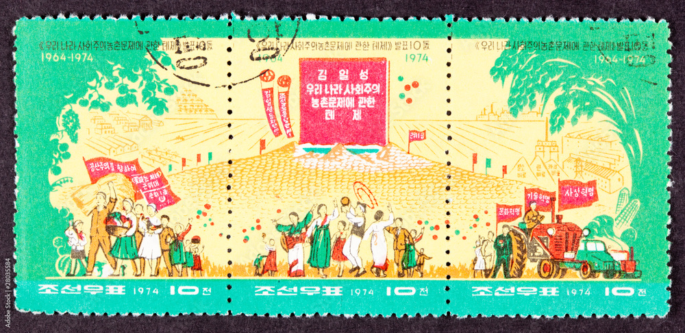 North Korean Postage Stamp Farmers Dancing Grain Piles Tractors