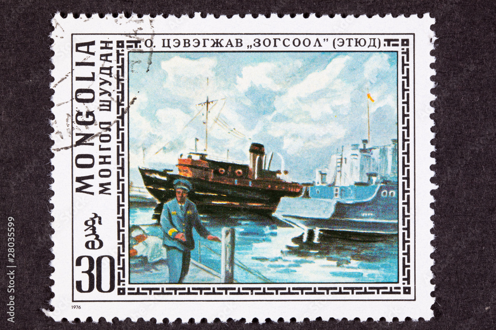 Mongolian Postage Stamp Cevegshava Painting Fishing Boats Harbor