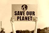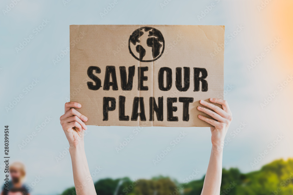 Person holding brown save our planet cardboard poster. Save the planet on a paper banner in men's hand. Human holds a cardboard with an inscription: Save our planet
