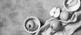Top view of preparing apples for apple pie, tart, cake on gray concrete background with place for recipe. Wide banner