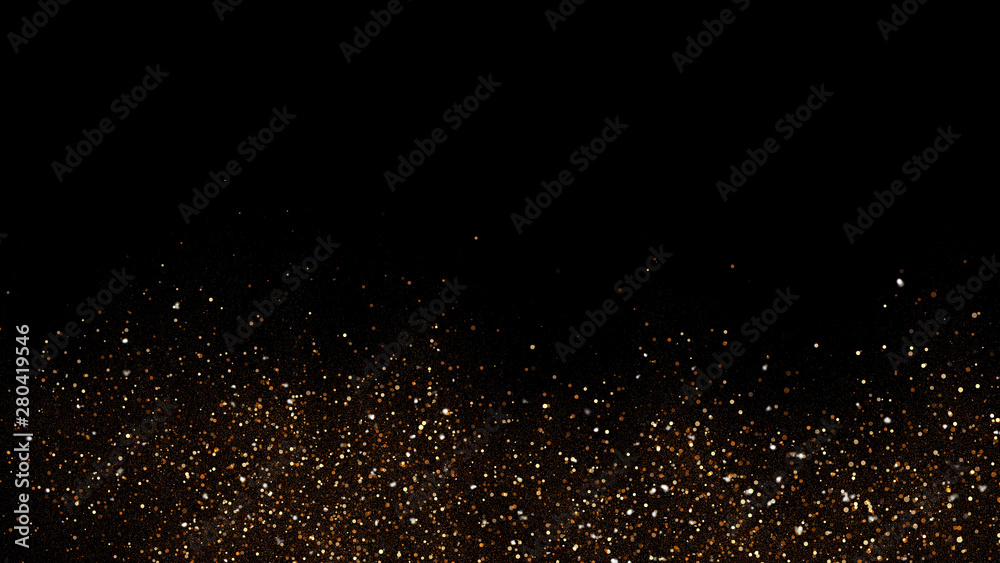 3d Illustration, Small gold dust, graphics of fire flakes, particle points and yellow-orange circles at below the frame