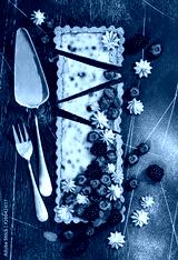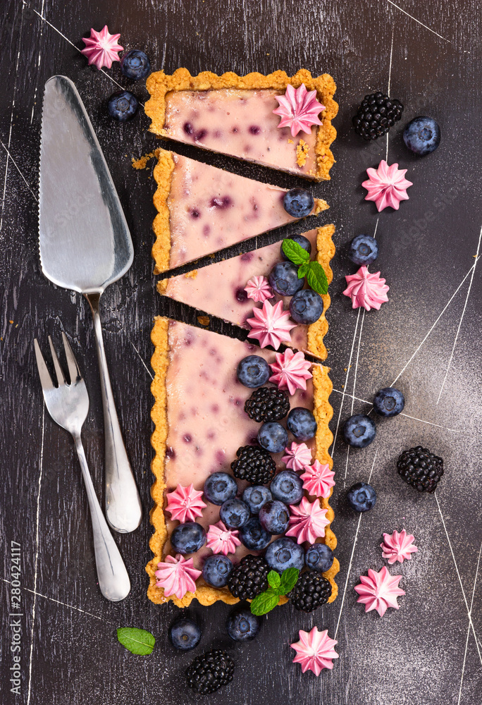 Cheesecake with fresh blackberries, blueberries, meringue and mint
