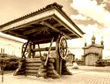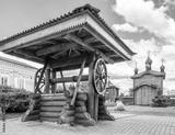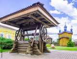 Wooden historic well and little church in Mazyr Castle in Belarus