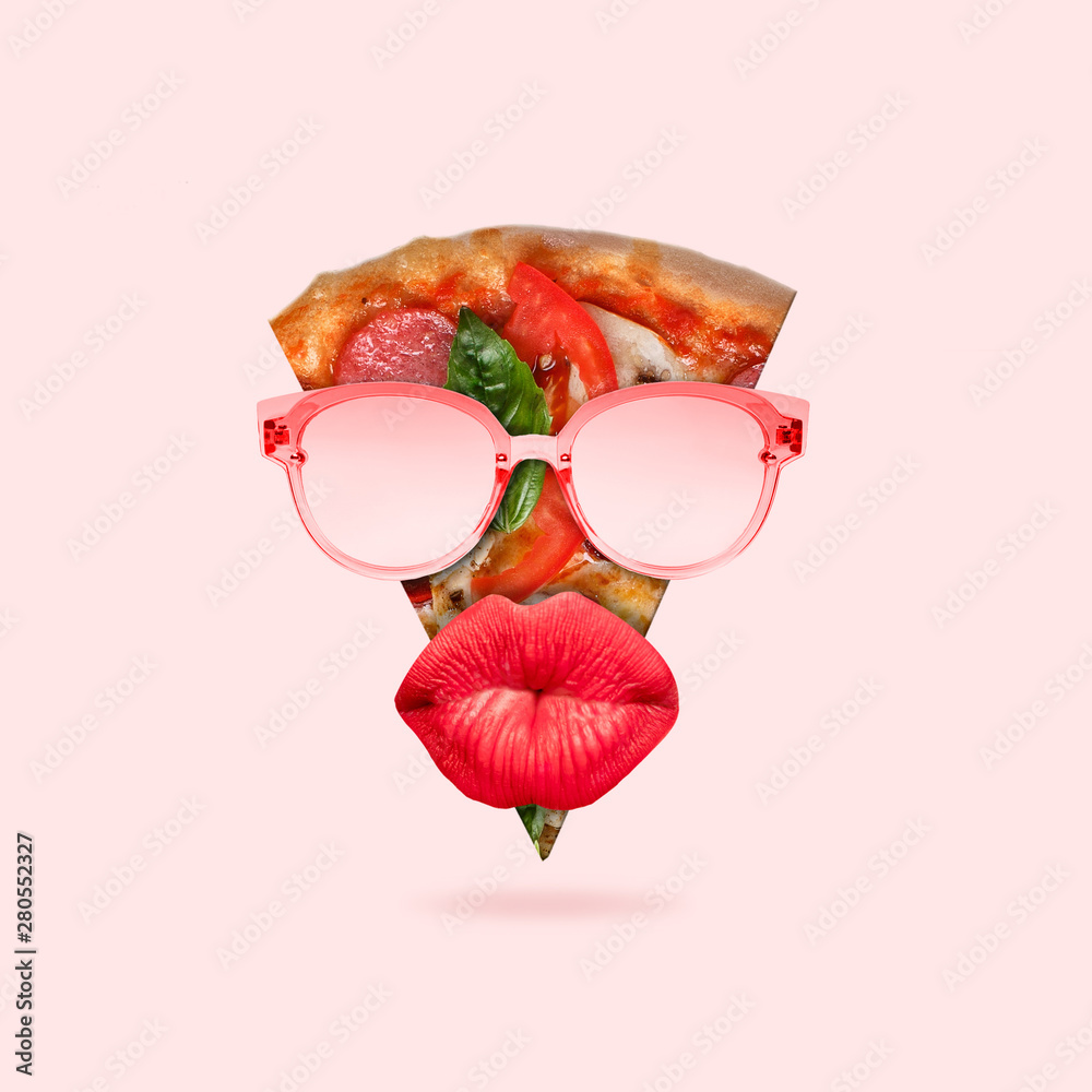 Emotions of happiness. Face as a pizza's slice with big lips and in sunglasses on pink background. Negative space. Modern design. Contemporary art. Creative conceptual and colorful collage.