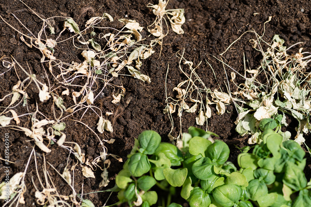 Closeup top view of Green grass and Dry grass on brown ground.
