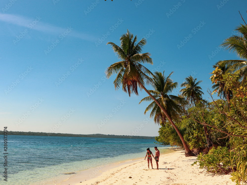 Lovely couple walking at the white sandy beach with palm trees in Onok Island in Balabac Philippines