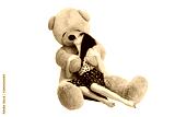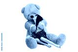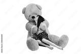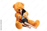 Portrait of young girl kissing a huge teddy bear isolated at white background.