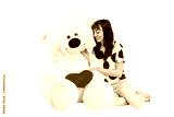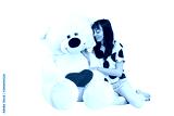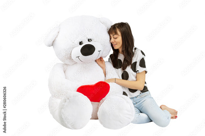 Portrait of young girl hugging a huge teddy bear with red heart isolated at white background.