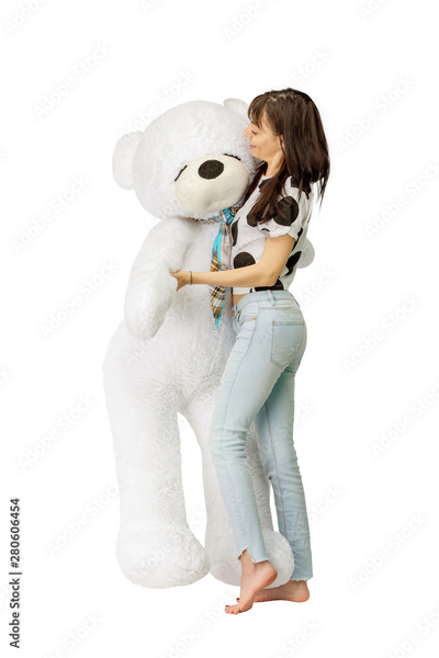 Portrait of young girl kissing a huge teddy bear isolated at white background.