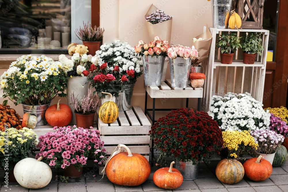 Pumpkins,squash and flowers on rustic wooden boxes in city street, holiday decorations store fronts and buildings. Halloween street decor. Space for text. Trick or treat. Happy halloween