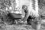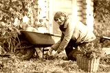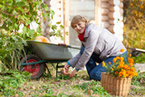Beautiful woman harvesting in the garden in autumn. Gardening activities. A middle-aged woman to clear the old diseased branches. Behind it is a log cabin. The sun shines.