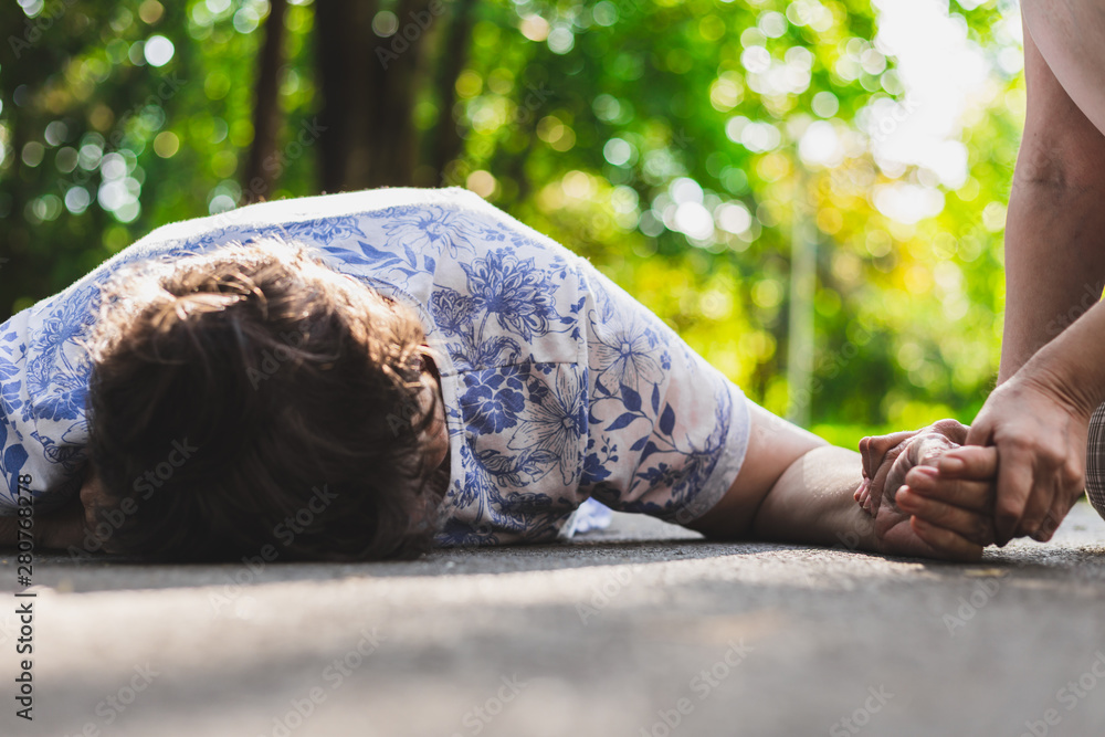 Old woman fell on the ground – Elder lying on the street while a citizen is trying to help her