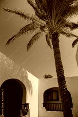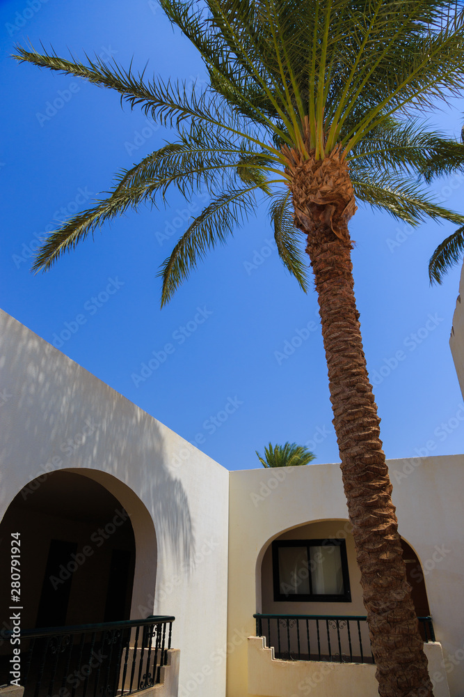 Palm trees and typical architectural heritage of ancient Egypt. Bright sunny light