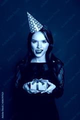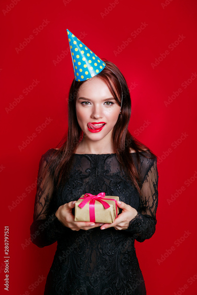 Happy woman in black dress holding gift box and looking at the camera on red background