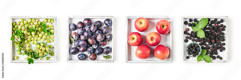 Fruits and berries on white wooden tray set.