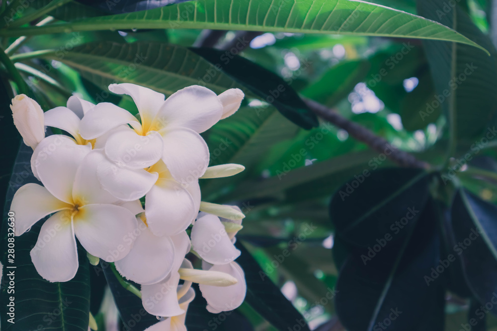 Close up of white flowers with blur naural green leafs background in park