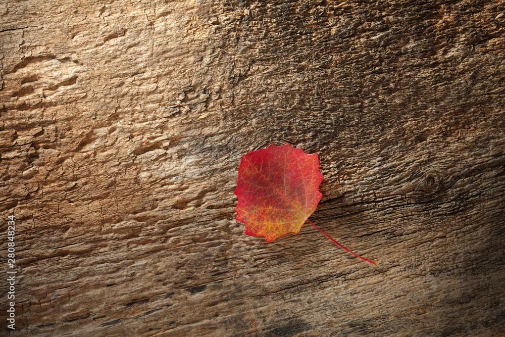 Red leaf on wood plank