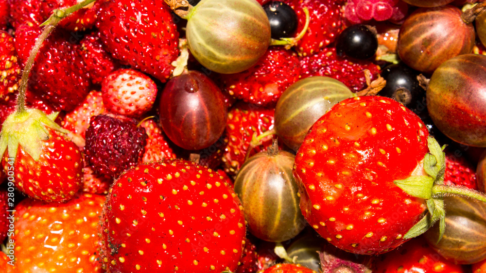 Wild berries in the assortment.Background with berries.Strawberries, currants, gooseberries.