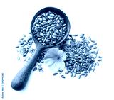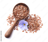 Flax seeds in wooden spoon on white background