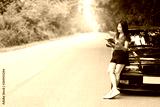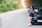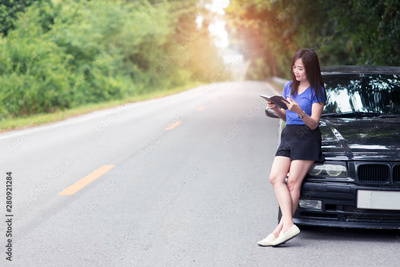 Smile woman traveler standing and reading a book with her car