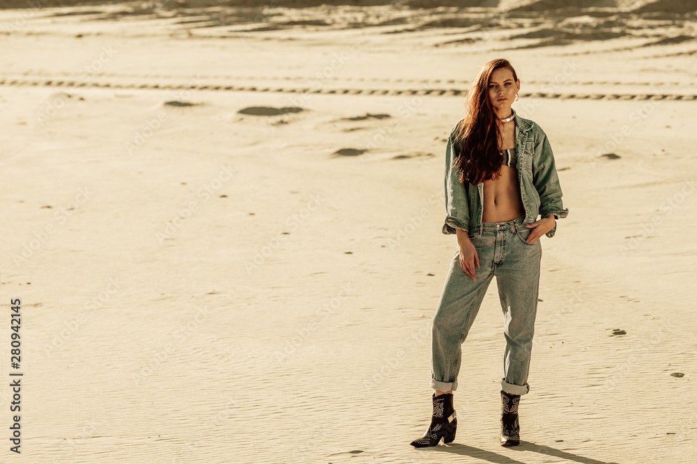 Outdoor full-length portrait of young fashionable woman with long hair, wearing total denim outfit: jacket, jeans, trendy cowboy boots, posing in the desert, at sunset. Copy, empty space for text