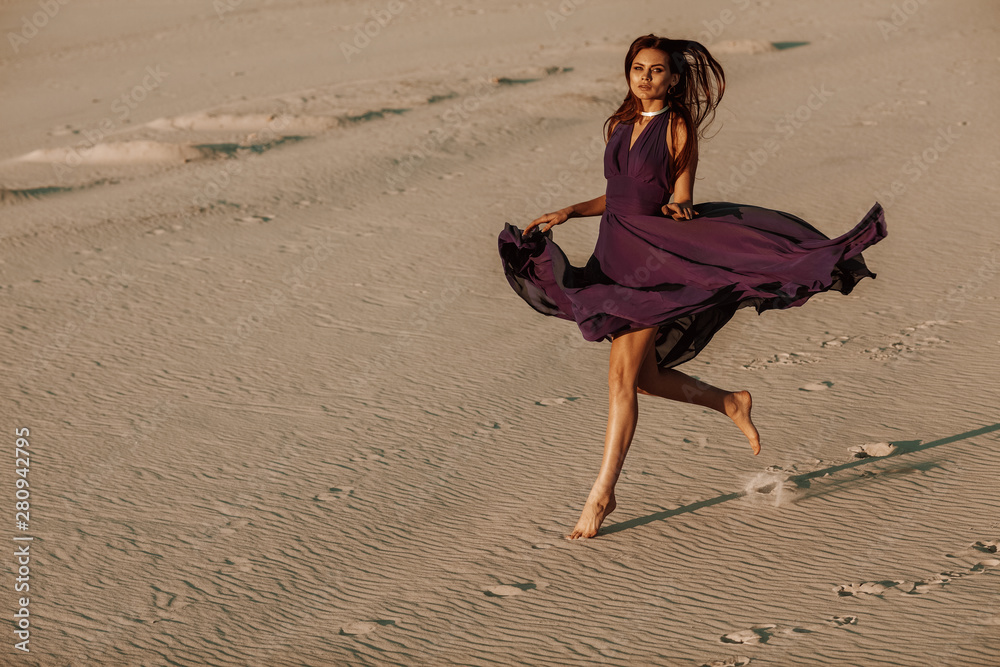 Outdoor full-length portrait of young beautiful woman with long hair, wearing luxury purple chiffon dress, running on sand in the desert, at sunset. Copy, empty space for text