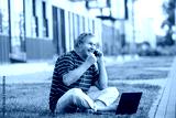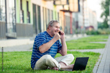 A handsome man on the lawn with a laptop excitedly watching content from the Internet.