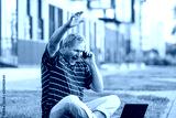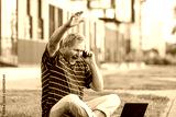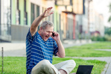 A handsome man on the lawn with a laptop excitedly watching content from the Internet.