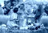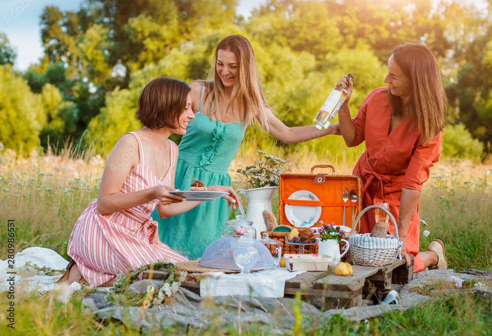 Beautiful young girlfriend girls women on a picnic in the summer fun to celebrate and drink wine.