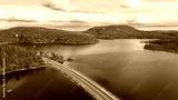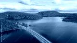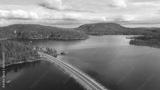 Aerial panorama of a road through forest and hills in Lapland on a cloudy day. Beautiful lake with blue water.