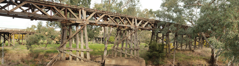 old timber hardwood discontinued railway bridge river crossing in a rural farming town, Victoria, Australia