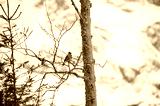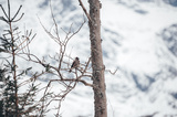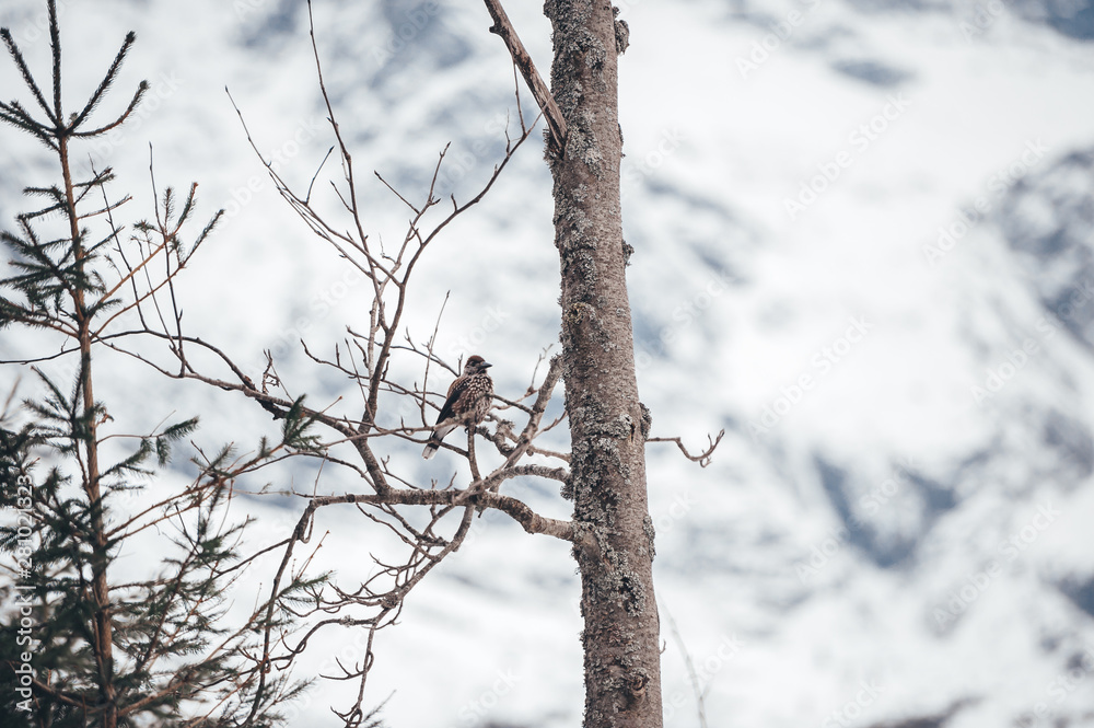 Small bird sitting on snowy tree branch on a background the winter mountains