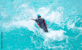 Cute asian boy having fun splashing into pool after going down water slide