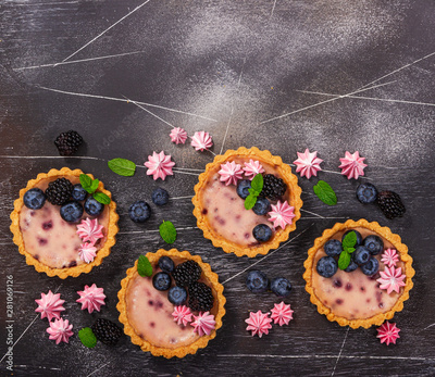 Four round shaped cheesecakes with fresh blackberries, blueberries, meringue and mint