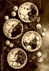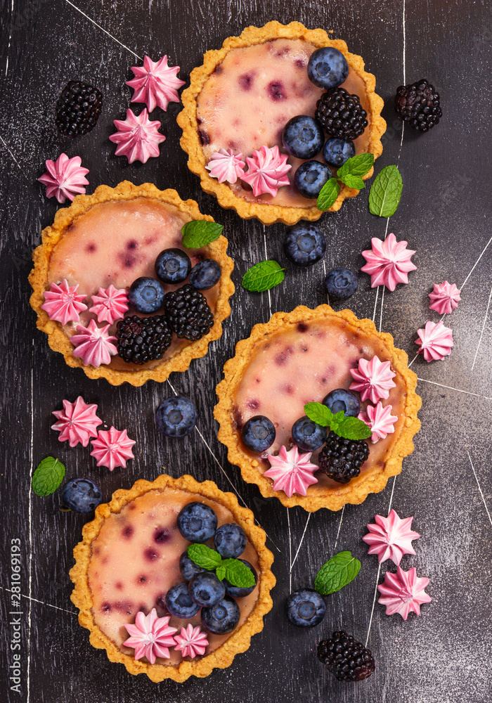 Four round shaped cheesecakes with fresh berries, meringue and mint