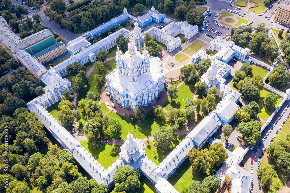 Smolny Cathedral in Saint Petersburg, Russia aerial view