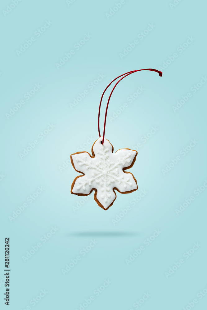 Mockup of Christmas gift card with homemade christmas gingerbread cookies in shapes of Snowflake falling over turquoise blue background. New Year Minimal Holiday Composition.