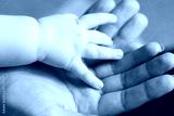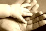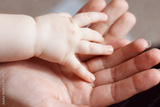 Parent hands holding newborn baby fingers. Happy family concept.