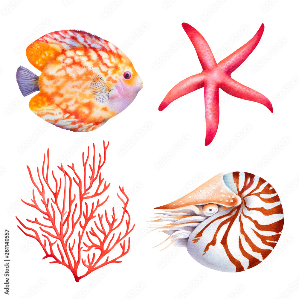 Set of coral reef animals. Coral, nautilus, butterfly fish, starfish. Isolated watercolor illustration.