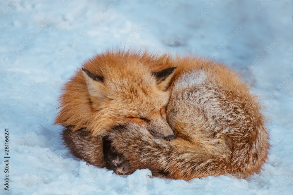 A Cute foxes Sleep on the snow during winter season in Zao fox village, Miyagi, Japan
