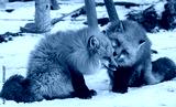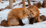 A Cute foxes on the snow during winter season in Zao fox village, Miyagi, Japan