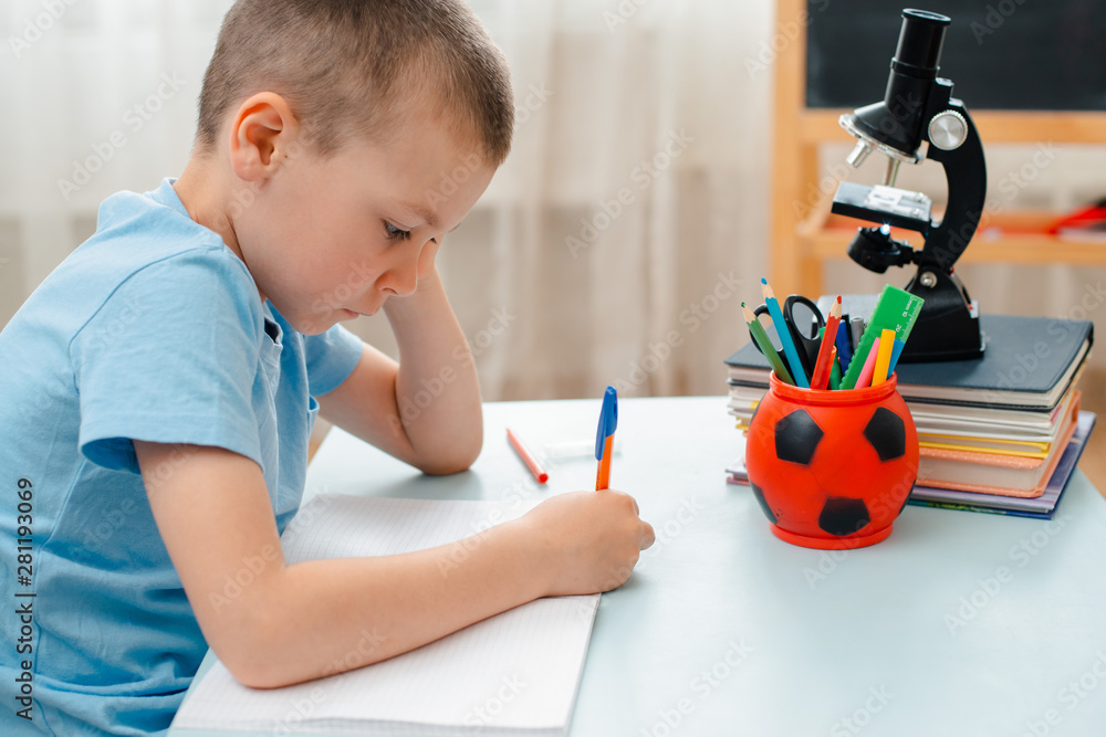 school boy sitting at home classroom lying desk filled with books training material schoolchild sleeping lazy bored