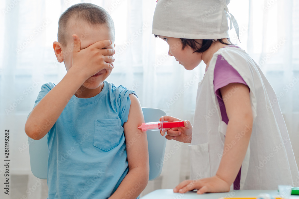 Children play in the hospital. The girl is dressed in a doctor 4 years old makes an injection to a boy 6 years old with a toy syringe in a room in a kindergarten.