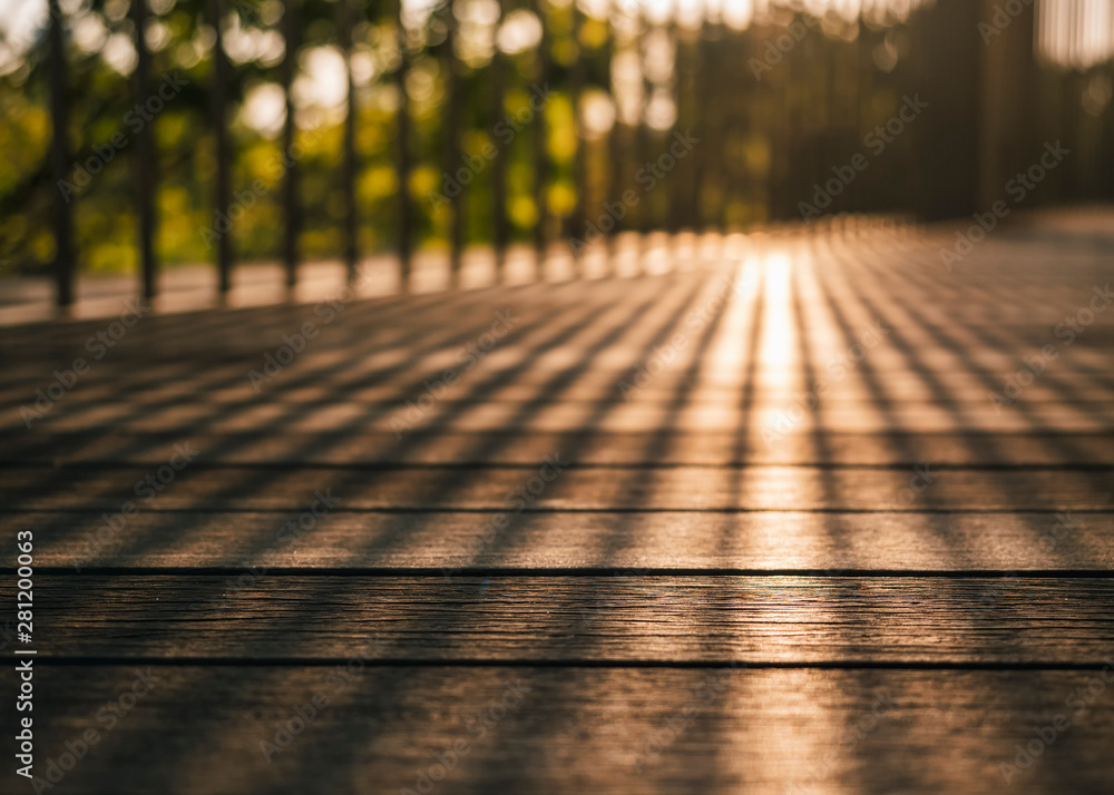 Wooden floor walkway Park outdoor morning sunlight shade shadow