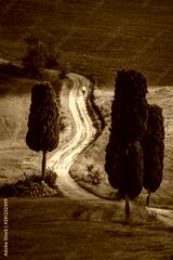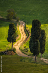 Fantastic sunny spring field in Italy, tuscany landscape morning foggy famous Cypress trees