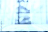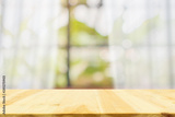 Empty wood table top with blur white curtain window and green garden background for product display template
