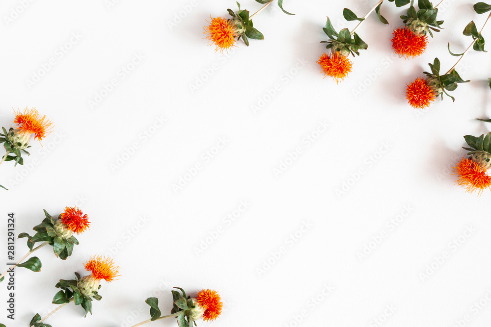 Autumn composition. Frame made of orange flowers on white background. Autumn, fall concept. Flat lay, top view, copy space