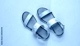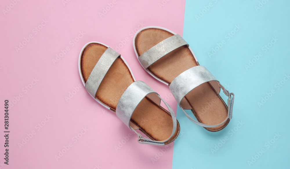 Leather female sandals on a pastel blue-pink background. Summer footwear, Top view